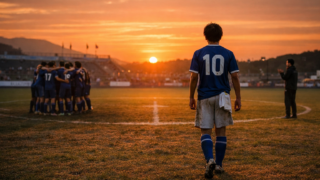 ピッチの芝は、まだ夜の名残をわずかに含んでいた。朝露が光を反射し、小さな星のように瞬いている。スタジアムの照明はまだ完全には消えず、空の淡い青と混じり合って、どこか夢と現実の境界を曖昧にしていた。 その中央、センターサークルに、一つのボール...