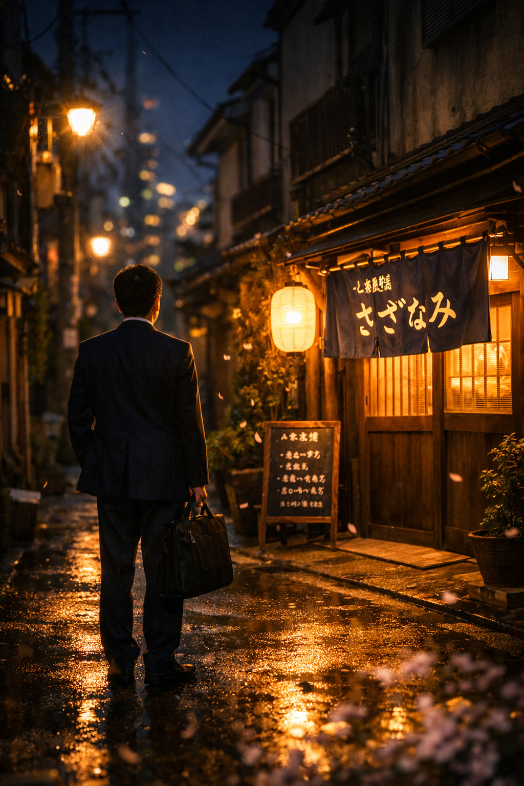 三年後の春、恒一は店の暖簾をくぐる前に、少しだけ空を見上げた。風はやわらかく、夜の匂いに花の気配が混ざっていた。今日は報告があった。企画部で一緒に働く女性と、秋に結婚することになったのだ。
